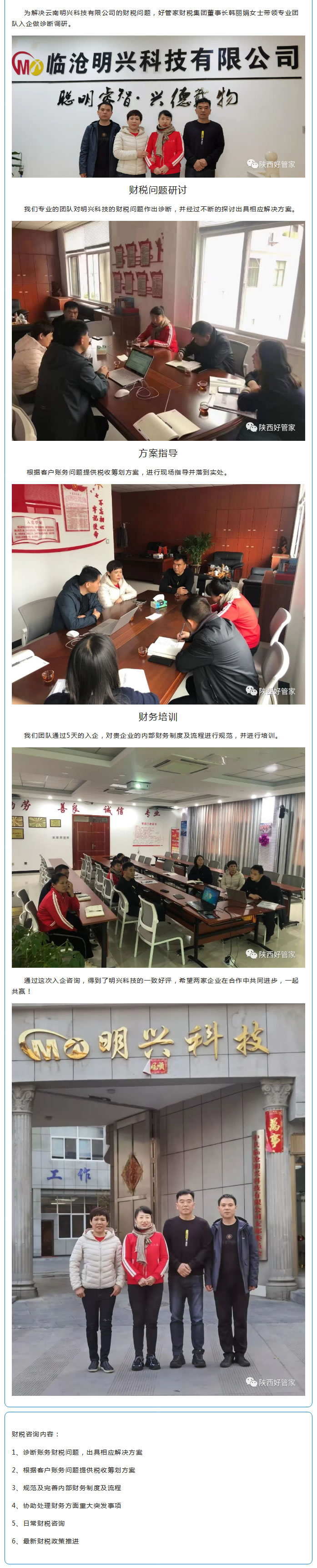 2022年2月18日,韩丽娟老师团队来到云南临沧对云南明兴科技有限公司入企进行为期5天的财税咨询服务。对企业财务问题进行全面诊断,帮助企业解决财税问题,得到客户的一致好评和认可!降低财税风险、节税增效、提升利润,财务精细化核算为企业财务决策保驾护航,找韩丽娟老师团队,咨询热线:18082232142(微信同号)。