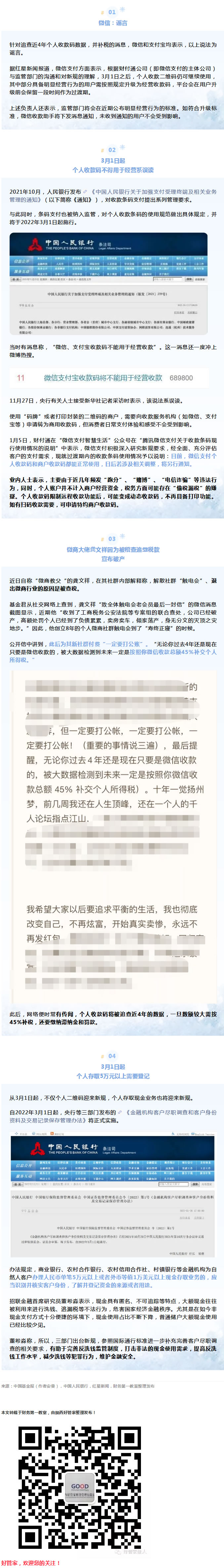 临近3月1日,个人收款条码的使用新规即将实施,又有网传消息称,自2022年3月1日起,微信、支付宝的个人收款码不得用于经营性收款。近4年的数据将被追查,一旦数额较大需按4.5%补税,还要缴纳滞纳金和罚款。