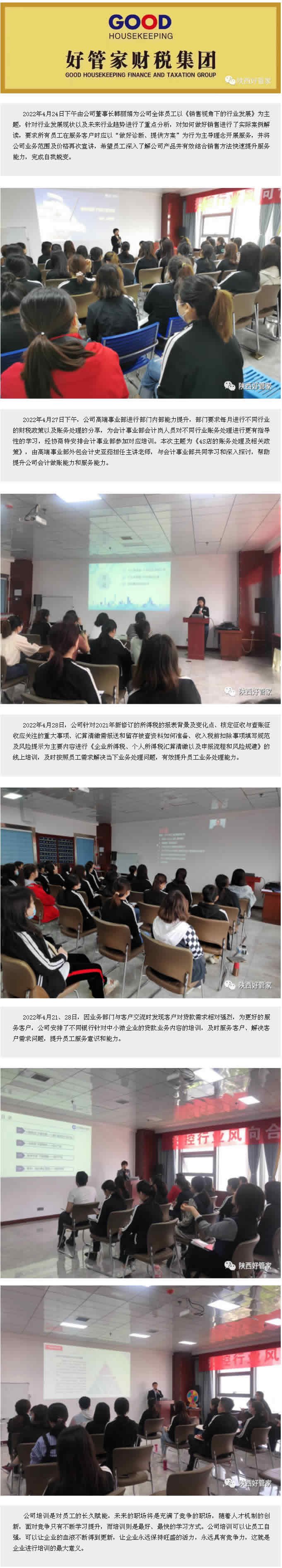 为进一步强化员工业务知识、提高销售技能及岗位专业服务技能,根据公司2022年培训计划总安排,近日,公司针对不同岗位培训需求分别开展了《销售视角下的行业发展》、《企业所得税、个人所得税汇算清缴以及申报流程和风险规避》、《4S店的账务处理及相关政策》、《贷款业务》的专题培训。