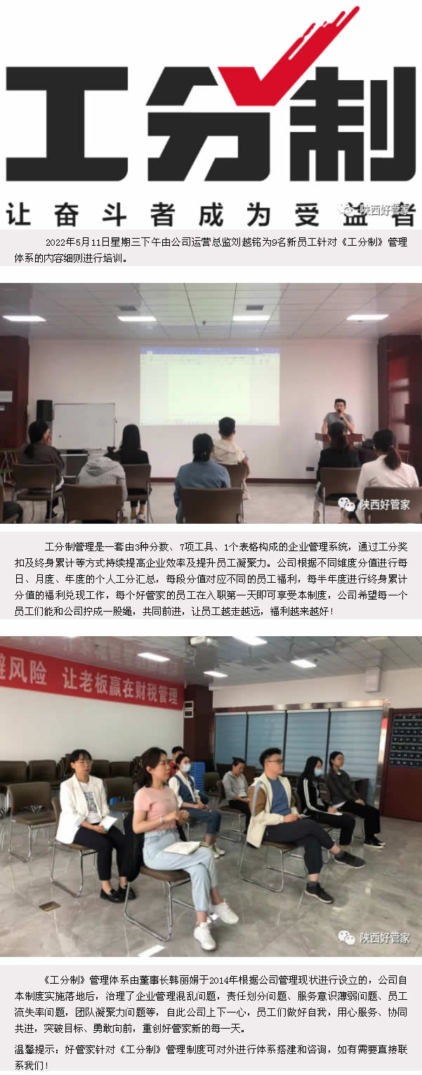 《工分制》管理体系主要是以提升公司管理工作效率、增强团队凝聚力而设立的,设立此制度是以明确职责,量化考核指标、规范员工工作行为、提升管理人员效能为目的。目前公司针对所有新入职员工进行每季度不定期的《工分制》专题培训工作,让员工深入了解公司制度,充分享受制度福利。