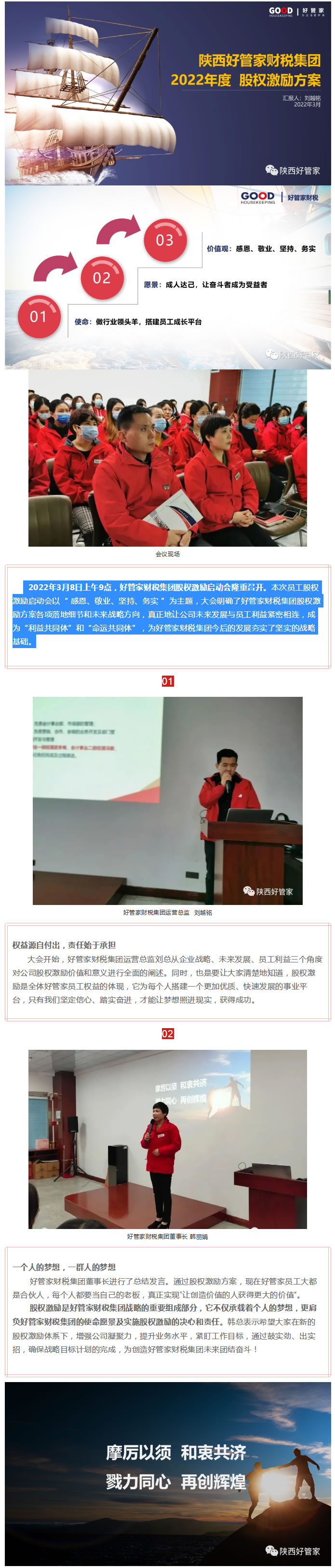 2022年3月8日上午9点,好管家财税集团股权激励启动会隆重召开。本次员工股权激励启动会以“ 感恩、敬业、坚持、务实 ”为主题,大会明确了好管家财税集团股权激励方案各项落地细节和未来战略方向,真正地让公司未来发展与员工利益紧密相连,成为“利益共同体”和“命运共同体”,为好管家财税集团今后的发展夯实了坚实的战略基础。