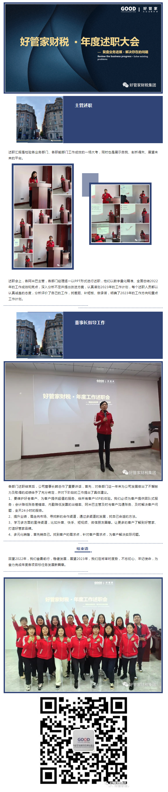 3月4日,好管家财税集团召开2022年主管述职大会。会议主要目的是总结经验、查找不足、谋划未来、促进发展、搭建相互学习、相互交流的平台,更好地提高管理水平。系统梳理总结了2022年度各部门工作完成情况,研究谋划了2023年目标任务和思路举措。