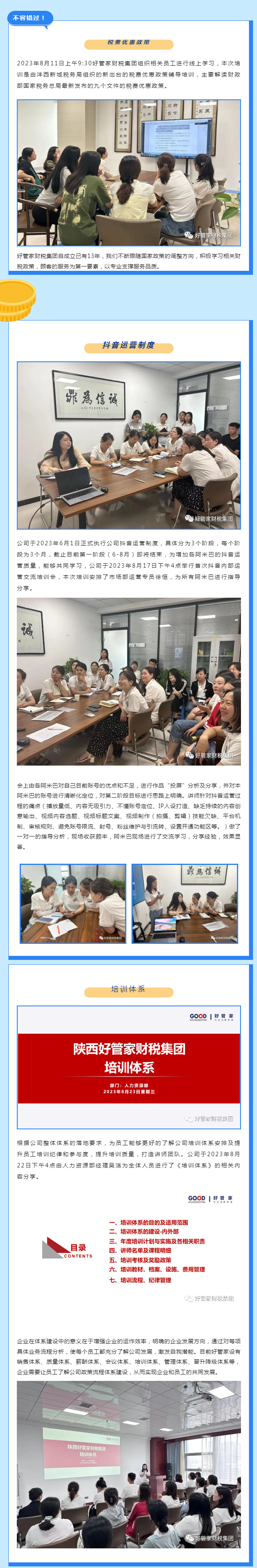 当前互联网+的发展下,改变了人们对于培训方式的重新定义,好管家财税集团从传统的面对面培训,到利用互联网的线上培训给员工们带来更广阔的世界观,加大企业文化协同,知识也越来越中心化,员工可随时随地进行学习,创造多样性的培训方式,不受时间、空间的限制,快速和及时性得解决员工学习需求,大大提升了员工培训的交互性和协作性。