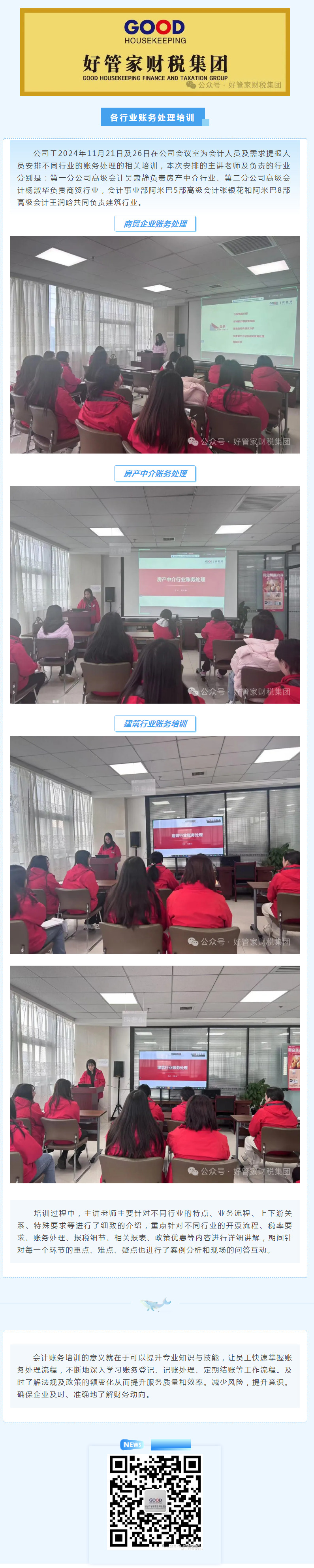 公司于2024年11月21日及26日在公司会议室为会计人员及需求提报人员安排不同行业的账务处理的相关培训,本次安排的主讲老师及负责的行业分别是:第一分公司高级会计吴肃静负责房产中介行业、第二分公司高级会计杨淑华负责商贸行业,会计事业部阿米巴5部高级会计张银花和阿米巴8部高级会计王润晗共同负责建筑行业。